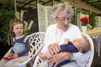 Sally O’Shaughnessy holds great-grandson Rafael for the first time, as great-granddaughter Charlotte looks on. Credit:Wayne Taylor