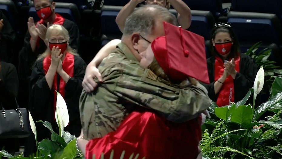An Air Force master sergeant surprised his daughter at her high school graduation in a tear-jerking moment that was captured on video.