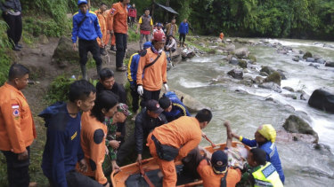 Rescuers remove the body of a victim of a bus accident in Pagaralam, Indonesia, on Tuesday.Credit:AP