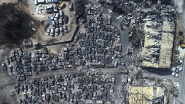 An aerial photo showing burnt vehicles filling a junkyard after being hit by a massive forest fire in Sokcho, South Korea.Credit:AP