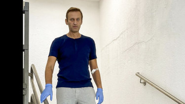 Russian opposition leader Alexei Navalny walks downstairs in a hospital in Berlin, Germany, on Saturday.Credit:Instagram/AP