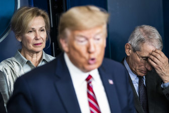 Dr Deborah Birx and Dr Anthony Fauci listen to Trump’s coronavirus briefing on March 20, 2020. Credit:Getty