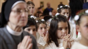 Children wait in the pews for their turn to get the Holy Communion at mass in Bulgaria. Credit:AP