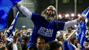 Likud Party supporters on Tuesday night in Tel Aviv.Credit:AP