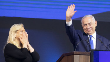 Benjamin Netanyahu, Israel’s prime minister, right, waves as wife Sara Netanyahu reacts at the Likud party HQ in Tel Aviv early on Wednesday morning.Credit:Bloomberg