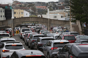 People queue at the St Vincent’s Bondi Beach COVID testing clinic on Friday.Credit:Getty