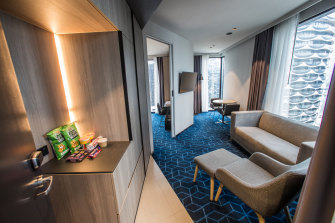A room at quarantine hotel Four Points by Sheraton.Credit:Jason South