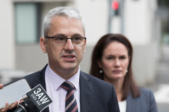 Acting Police Minister Danny Pearson and COVID-19 Quarantine Victoria Commissioner Emma Cassar at the Four Points by Sheraton hotel in Docklands on Wednesday.Credit:Jason South