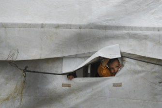 On the outside looking in: a child peeks through the flap of a tent in the foreign section of al-Hawl camp in Syria.Credit:Kate Geraghty