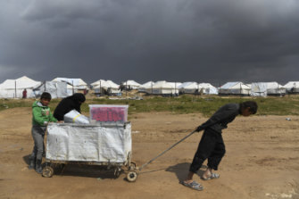 A woman and two boys push a cart near the fence line of the foreign section of al-Hawl camp.Credit:Kate Geraghty