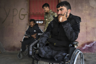 Syrian Democratic Forces soldier Swar Rojdam, 23, right, with fellow injured soldiers.Credit:Kate Geraghty