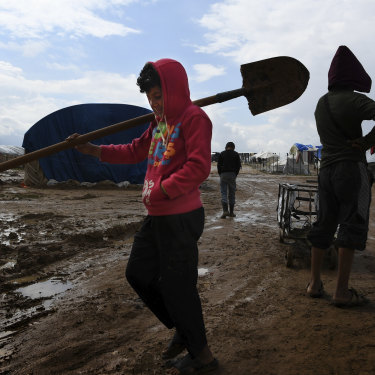 Children carry tools through the mud at the squalid al-Hawl camp.Credit:Kate Geraghty