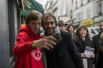 Cedric Villani (right) poses for a selfie while campaigning for mayor in Paris on Jan 25, 2020. Credit:The New York Times