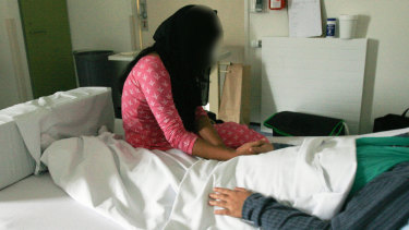 Sazada Akhter’s sister, Nahida Akhter, left, visits her in hospital last week.Credit:Amy Wright/Stuff